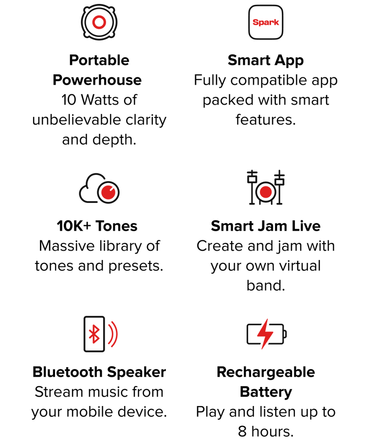 Take your tone anywhere with Spark MINI – a rechargeable battery-powered guitar amp and Bluetooth speaker with smart app integration and multi-dimensional sound.